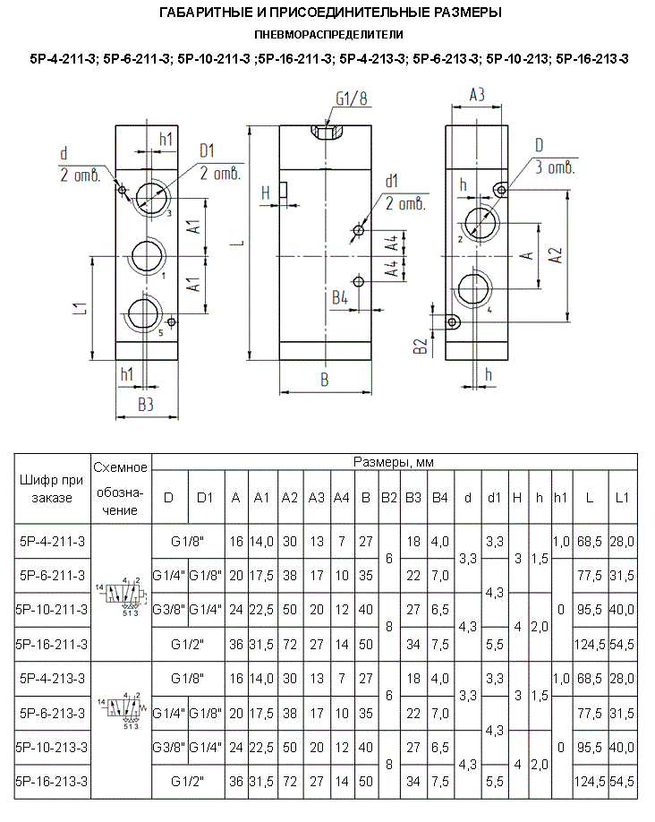| Исполнение | Пятилинейный двухпозиционный, с односторнним пневматическим управлением и пневматическим возвратом в исходное положение. Конструкция распределительного устройства: цилиндрический золотник |
